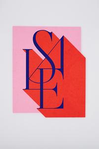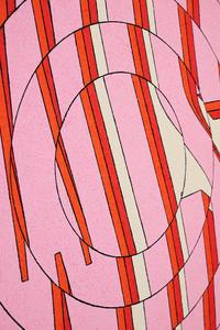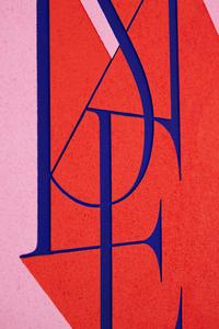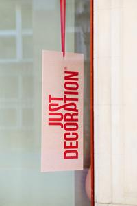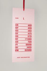 acrylic on PVC, 120 x 50 cm, 2024 A giant, double-sided clothing tag in vibrant colors, this acrylic painting displays the “JUST DECORATION” logo on one side and the price of the work in multiple currencies on the other, like on an original product label.ENJOY
