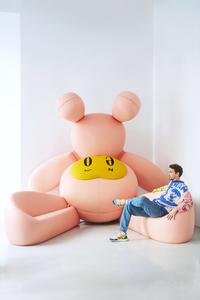 fiber glass, plywood, artificial leather, 249 x 300 x 280 cm, 2025 This oversized plush bunny, with ‘ENJOY’ emblazoned across its face and its ears transformed into functional sofas, appears as if casually discarded. Both a playful sculpture and a usable design object, it evokes childhood nostalgia. The “ENJOY” inscription on its face serves as both a simple invitation to rest and relax and, due to its size and context, has a subtle ironic undertone.SORRY