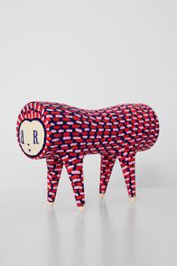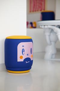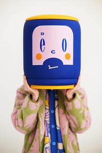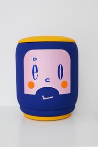 EPS, artificial leather, linden wood, plywood, MDF, Polyurethane Foam, 50 x 37 cm, 2025 A simple ottoman. The bearded man’s face on its side is formed by the letters of the word DECOR, because this is also just a ‘decoration’ piece.GONE