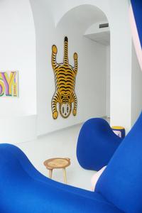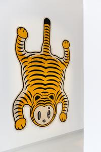 hand tufted rug from India, 300 x 175 cm, 2024 The size of the spread-out tiger rug (3 m) corresponds to the average body length of a tiger (2.2 - 3.3 m). This is a frequently used graphic and decorative element. However, the word ‘GONE’ on its face refers to extinct tiger species and their endangered status. The rug was handmade in India.EASY TO SEE