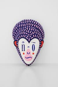 acrilyc on wood, 54 x 21 x 21 cm, 2025 The artwork “BEAUTY IN UNEASE” was born from a damaged, woodworm-eaten, discarded wooden sculpture that could have originally served as a decorative object. After its transformation by the artist, the word ANXIOUS forms the face of the sculpture, while its body is speckled with decorative blue brushstrokes. The almost animal-like creature protectively holds its belly. She is pregnant. The core concept of the piece is to highlight a mother-to-be’s deep, existential anxiety about her future, her child, and her own destiny. At the same time, the artist also alludes to their own uncertainty with the word ANXIOUS, as art is a form of creation whose value and acceptance the artist constantly questions.ANXIOUS Mask