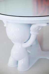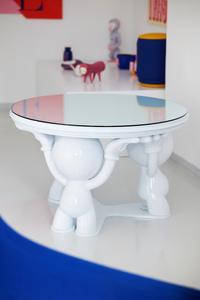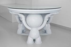 FRP, MDF, glass, 73,5 x 122 x 122 cm, 2024-2025 The artwork titled Table of Freedom moves along the boundary between functional design and conceptual sculpture. Three unified figures, each with the word ‘FREE’ forming their faces, collectively support the round tabletop. The figure is a complex metaphor for the illusion of freedom and servitude. It forces the viewer to confront the central ambivalence: Are the figures serving others under the illusion of freedom, or have they freely chosen servitude? The artwork contrasts the Camelot ideal of social equality (‘Round Table’) with the Orwellian reality (‘some are more equal than others’).