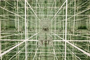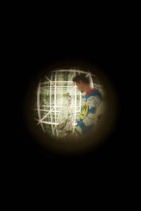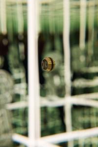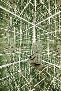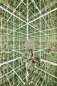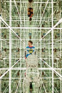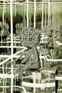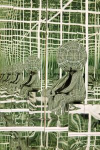 This refers to a technical process where an object (clothing, device) adjusts itself to a person. The small mirrored figure is self-fitting in relation to the space, meaning it adjusts and conforms itself to the infinite, mirrored environment.FIT WITH MYSELF